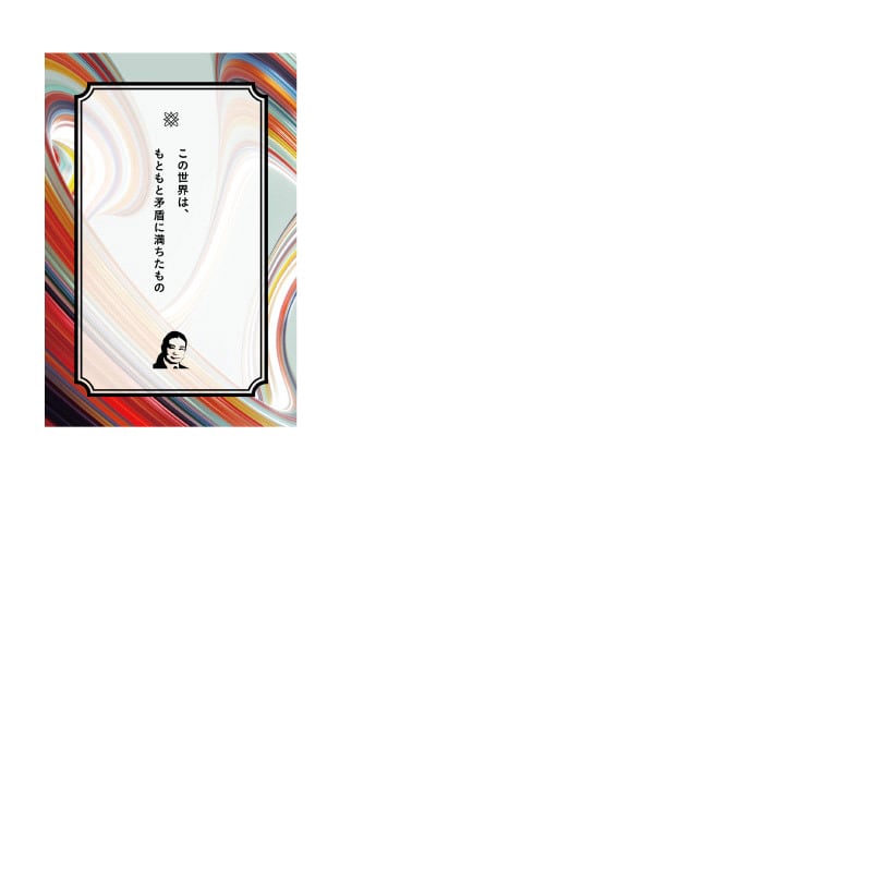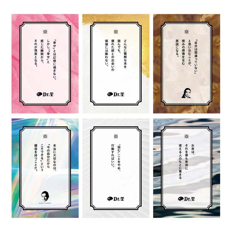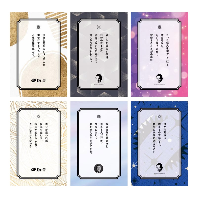 コーナー内で配信された名言の中からさらに厳選されたことばでポストカードをつくりました。ポストカードには、苫米地博士がいつも優しく見守ってくれているような光景を思わせる、温かく柔らかな印象の高級紙「マーメイド スノーホワイト」を使用しています。どんなインテリアにもマッチするようシンプルでスタイリッシュなデザインに仕上がっています。